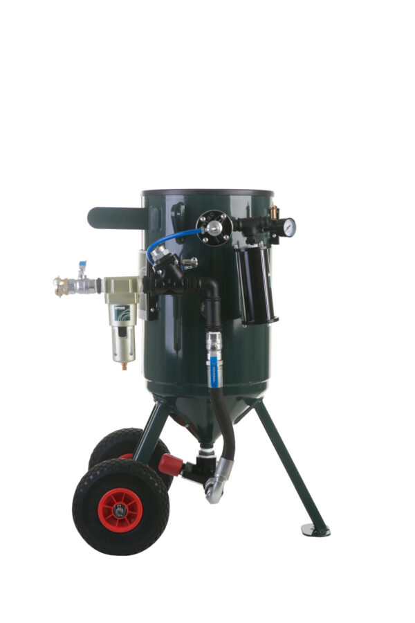 Die 20- und 40L-Strahltanks können mit einer Strahlpistole wie abgebildet ausgestattet werden, eventuell auch mit Nassstrahlkopf.